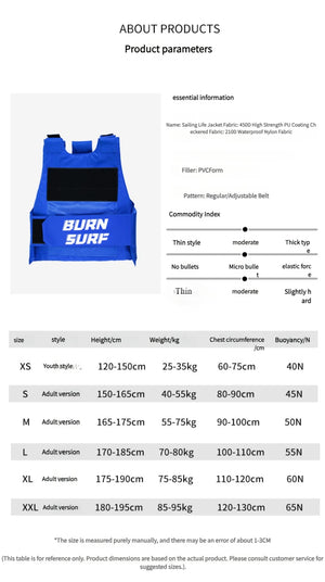 COMFORT - Less bulky design for use when quick response is likely, offers a larger range of motion making it a favorite for water activities. Closed sides, zipper, and double buckle closure keep life jacket securely in place, Burnsurf remains comfortable against the skin for all day wear